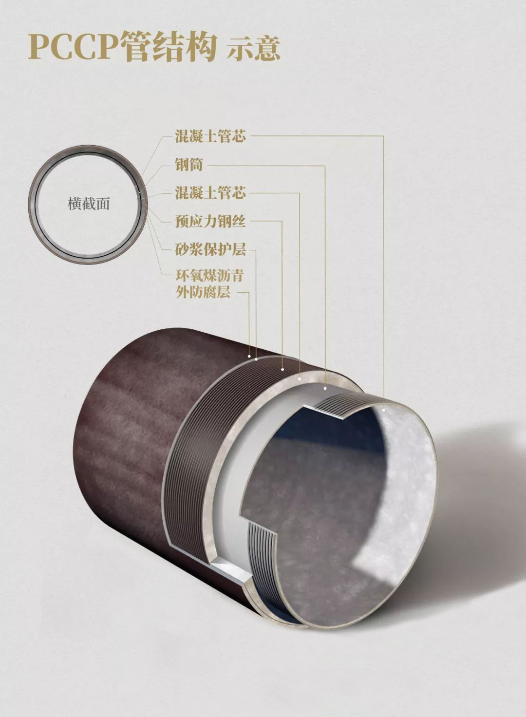 PCCP 管并非簡(jiǎn)單的材料堆砌,而是鋼板、預(yù)應(yīng)力高強(qiáng)鋼絲、混凝土、保護(hù)層砂漿的 “天作之合”。鋼板以其超高的抗拉強(qiáng)度和絕佳的抗?jié)B性能,成為抵御水壓的堅(jiān)固防線;混凝土則憑借出色的抗壓能力、優(yōu)異的耐腐蝕和耐磨損特性,以及強(qiáng)大的抗外壓荷載能力,確保管道在復(fù)雜環(huán)境下長(zhǎng)久穩(wěn)定運(yùn)行。二者優(yōu)勢(shì)互補(bǔ),再加上預(yù)應(yīng)力高強(qiáng)鋼絲和保護(hù)層砂漿的協(xié)同作用,賦予了 PCCP 管超長(zhǎng)的使用壽命,為輸水工程提供了可靠的保障。正因如此,PCCP 管廣泛應(yīng)用于水利工程的遠(yuǎn)距離、大口徑輸水,以及工業(yè)、農(nóng)業(yè)及市政供水等工程,從跨流域調(diào)水的 “大動(dòng)脈” 到城市供水的 “毛細(xì)血管”,都有它忙碌的身影。